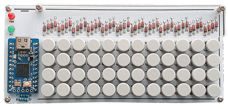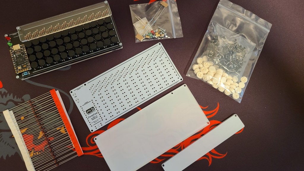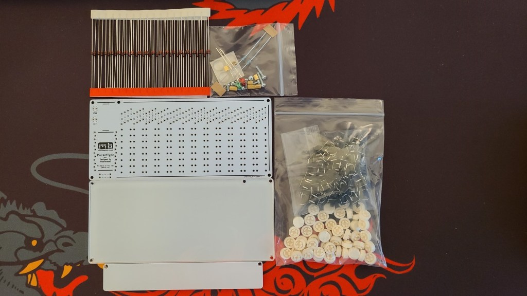 Like other kits, you can solder in the diodes (black stripe down), the resistors, the LED’s, switches, and pro micro in any order you see fit (I soldered them in the order I listed here). Then you pop on the caps, screw in the acrylic pieces, and Bob’s your uncle, you’re done! Just don’t forget to flash the pro micro with the PocketType firmware (or with a custom profile, if you’d like) before you put that on there and it should be good to go.