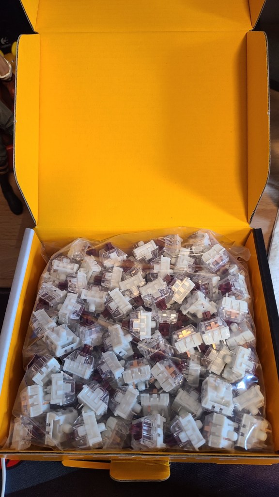 For this keyboard, I decided to go with a less noisy switch, the Kailh Speed Copper switches, a tactile (I plan to use this for work and clicky switches tend to distract people when they’re talking on video chat, hence the choice, though I love Kailh Speed Bronzes (clickies) and have them on my Dygma Raise).