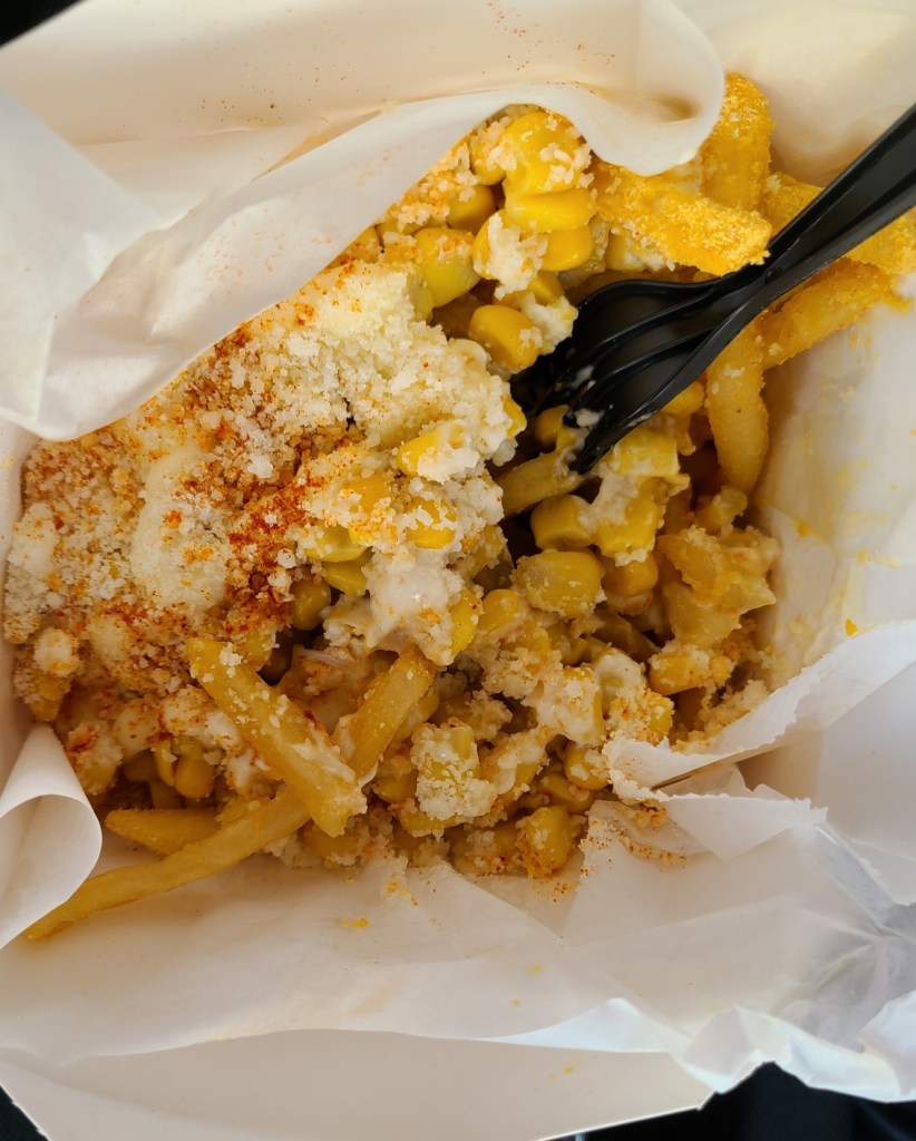 When I looked at pictures of the food and drink, I was immediately interested in a few things they had to offer. One of which was the Elote Fries and, of course, the Popcorn Chicken, both of which we ordered.