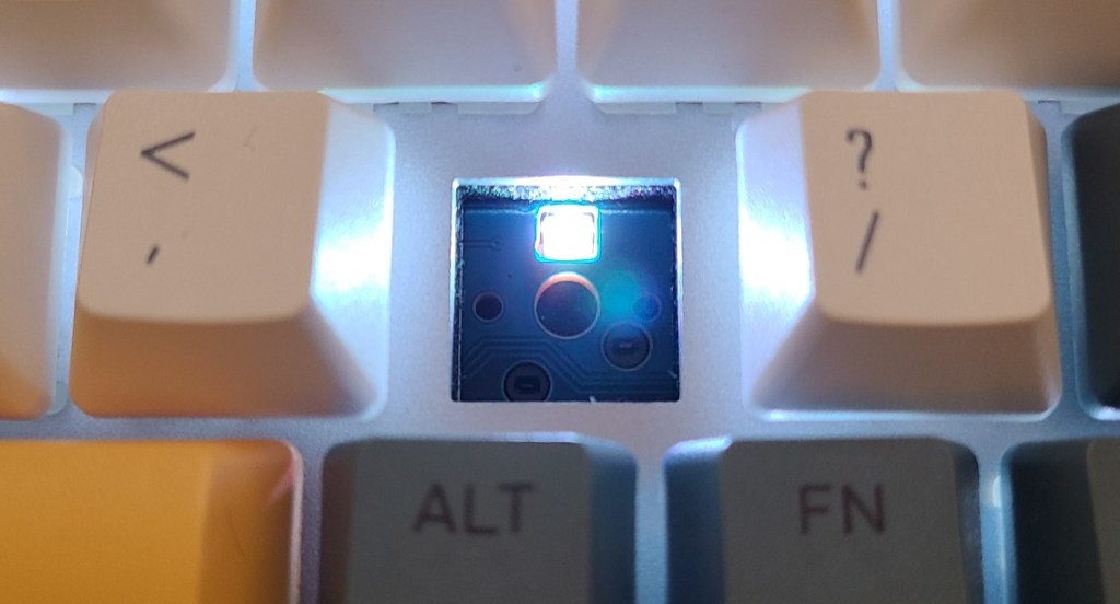 I chose white lights to show how much shine-through there is (refer to picture of full keyboard above for more). It has a 5-pin PCB though, so that’s a plus!
