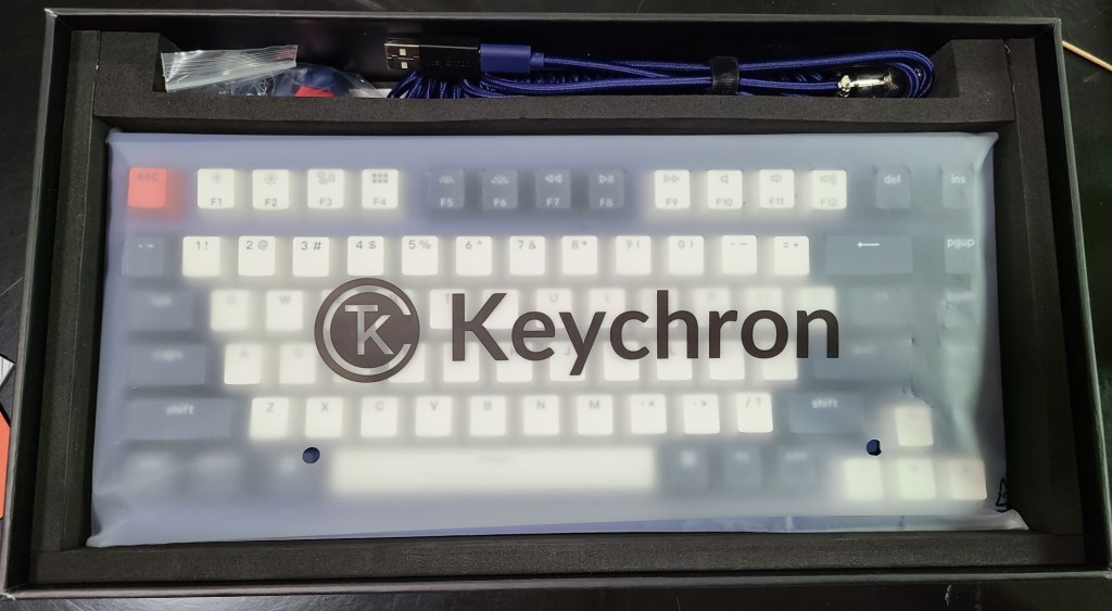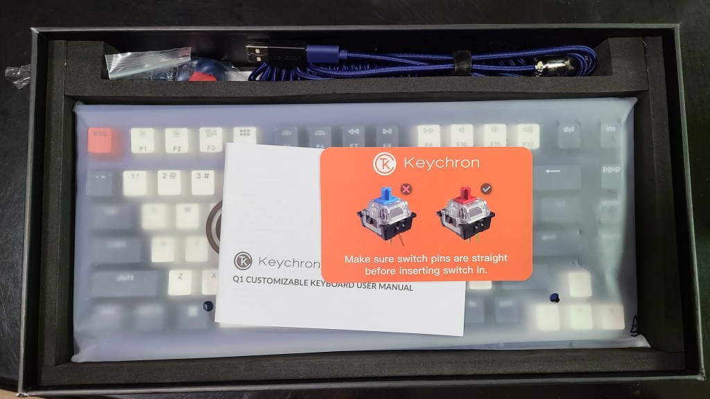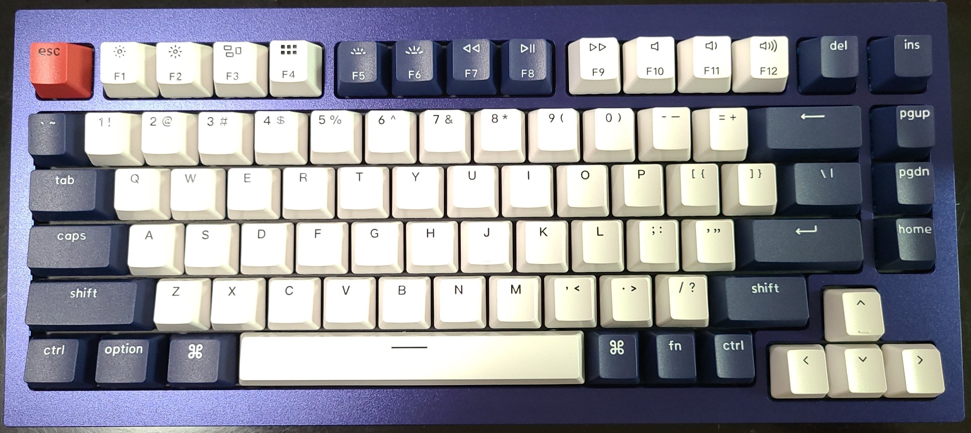 The “Keychron Q1 QMK Custom Mechanical Keyboard” is a keyboard that is in direct competition with the “Glorious GMMK Pro” by Glorious PC Gaming Race. Both have a very similar 75% layout (though the GMMK Pro has an additional key, the rotary encoder), both are hot-swap, aluminum-bodied, are customizable through open-source firmware (keymapping), and have south-facing LEDs. Both are also Win/Mac compatible, though the Keychron has an upper hand on this because it’s pre-programmed (you flip a switch on the back) but have to go through firmware to do the same for the GMMK Pro. Cost-wise, you get more bang for your buck with the Keychron since for the same price as the GMMK Pro, which is a barebones kit, you get your choice of switches, matching keycaps, and a not-totally-terrible coiled cable in the color of the board. Barebones for the Keychron is twenty dollars cheaper at the time of writing.