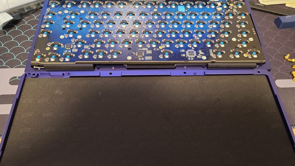 Interior-wise, it’s foamed for a bit of sound dampening. But it doesn’t really do much, in my opinion. There’s still that harsh hollow metallic tang on some of the key presses, which made me originally think there was no foam in there at all, and the plate seems to be made of some sort of plastic. PCB itself is pretty clean though; one thing of note, it’s attached to a chip screwed onto the top so careful when taking it out of the case.