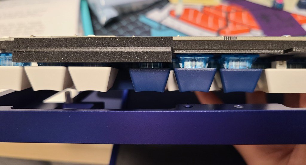 As you can see below, they mounted foam in between the plate and the PCB as well. And used more foam to cushion it against the aluminum body to make it gasket-mounted. Not sure I really feel the flexibility but I sure do hear the mechanical in mechanical keyboard (not in a good way)!