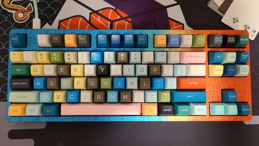 Anyway, I like it! It feels nice, it’s fun and unique, and it works well. Nothing I can complain about, really, except I was dumb enough to put SA profile keycaps on it; can’t see the backlight on the board AT ALL. At least the keycap colors make up for lack of shine shine…